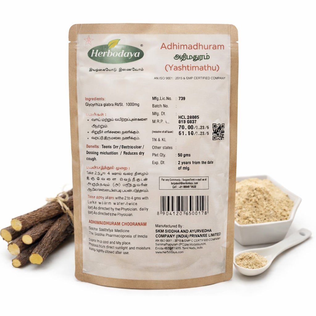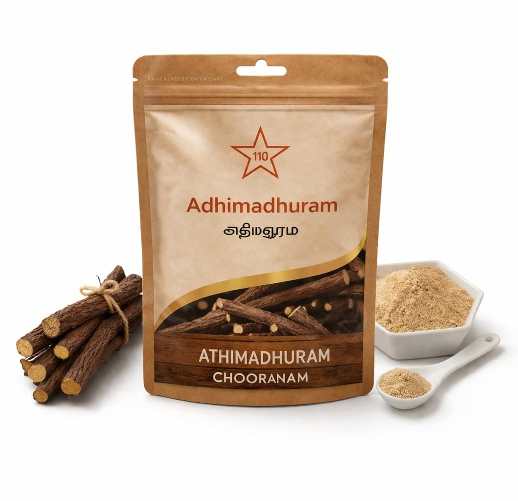 Athimadhuram Chooranam is a herbal powder prepared from licorice root, known for its soothing and healing properties. It has been traditionally used in Siddha and Ayurvedic systems. The powder is finely processed to maintain its natural benefits.