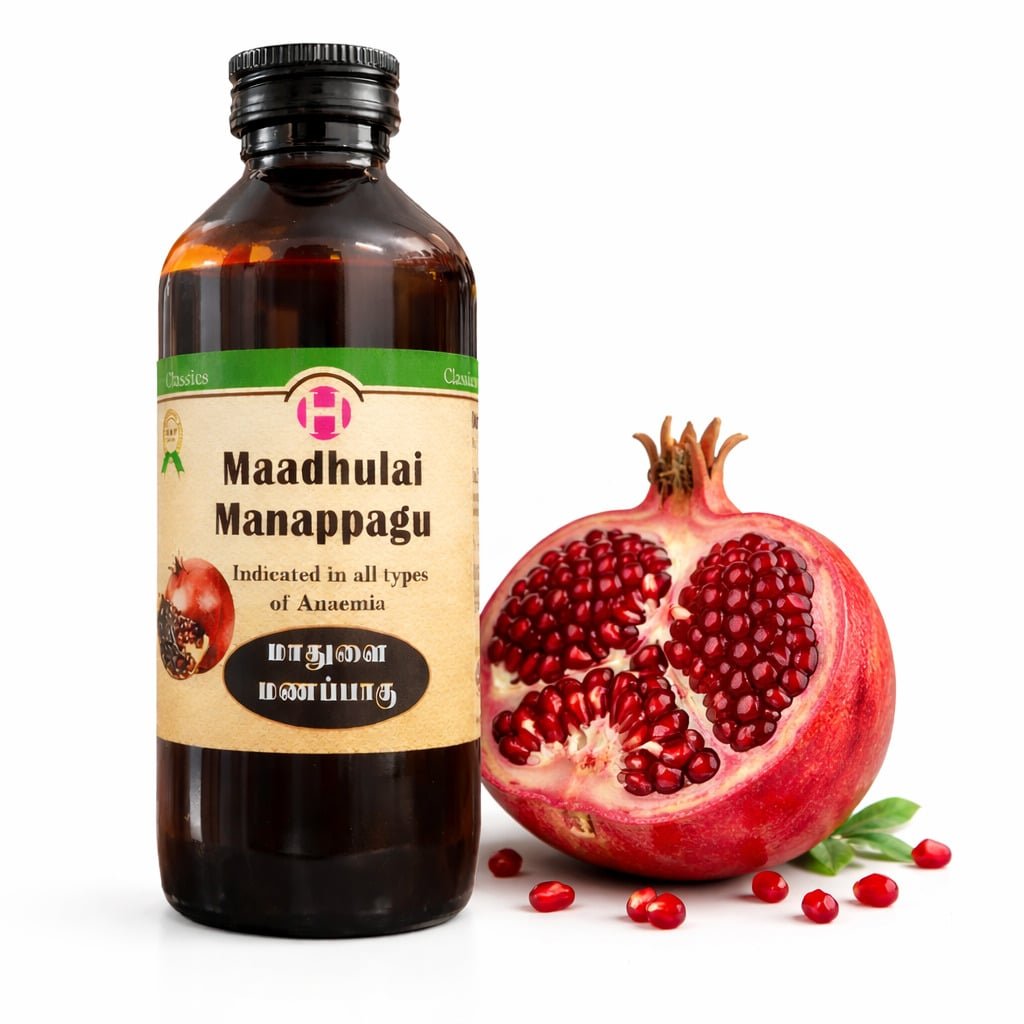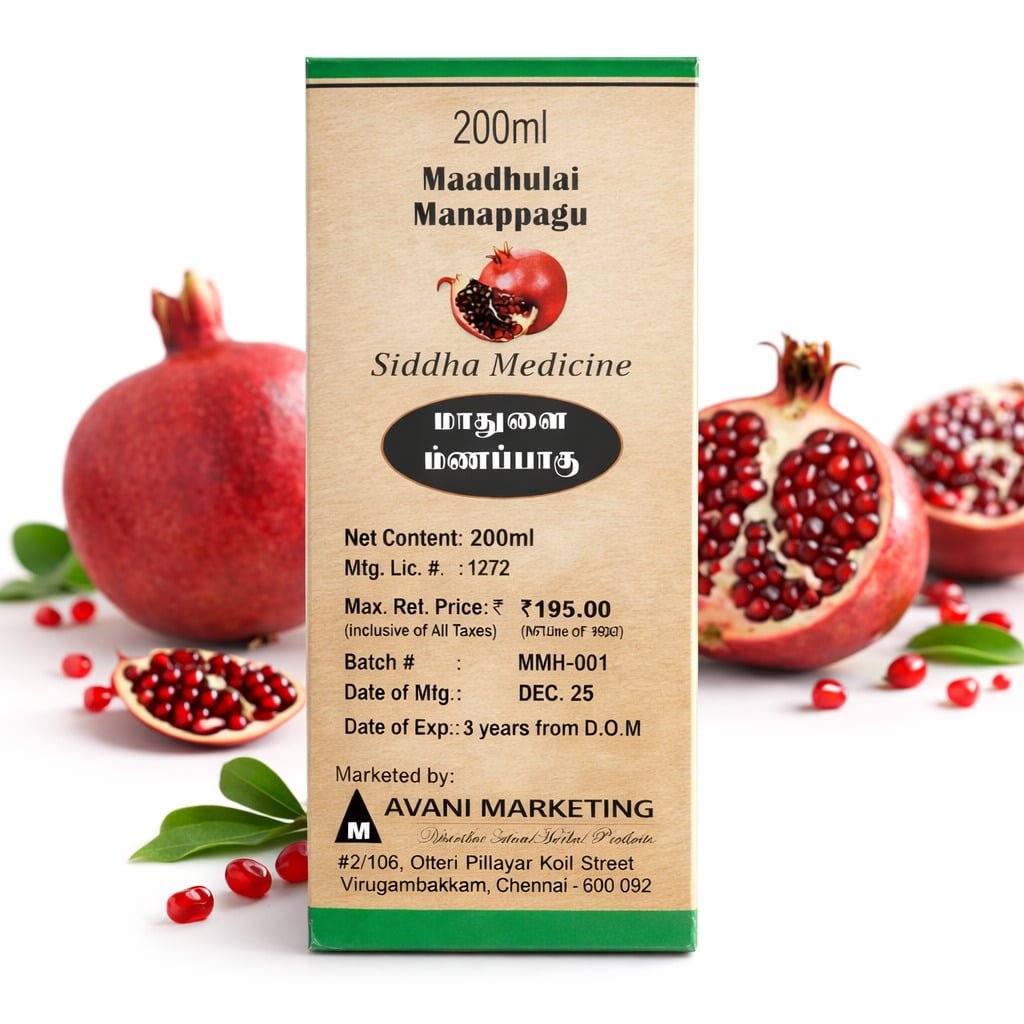 Madhulai Manapagu is a traditional herbal syrup prepared from pomegranate and other natural ingredients. It has been widely used in Siddha medicine to support digestive health. The syrup is prepared using traditional processing methods to retain its natural benefits.